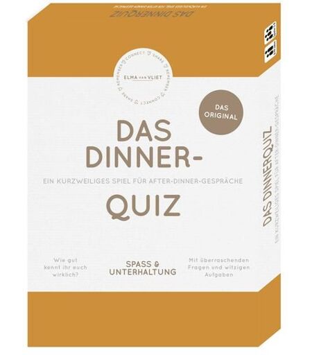 Unterhaltsames Fragespiel für Freunde und Familie rund ums Kochen & Essen Das Dinnerquiz ist ein originelles Geschenk für alle, die gerne kochen oder nach dem Essen noch gemütlich zusammensitzen. Das Konversationsspiel fragt nach Lieblingsrezepten, kulinarischen Erinnerungen oder Wissenswertem aus der Küche und führt so zu spannenden und unterhaltsamen Gesprächen mit Familie oder Freunden. Erzähl- und Quizspiel für 3–8 Spieler 110 Spielkarten in den Kategorien »Weißt du es?«, »Erzähl mal!« und »Aktion« mit Spielanleitung in einer hochwertigen Box Originelles Mitbringsel oder Geschenk zur Essenseinladung Ein schönes Geschenk für Freunde und Familie, das lustige und unterhaltsame Gespräche anregt Mit dem Fragespiel wird die Essenseinladung, der nächste Geburtstag oder Weihnachten zu einem spaßigen und besonderen Erlebnis für alle. ...