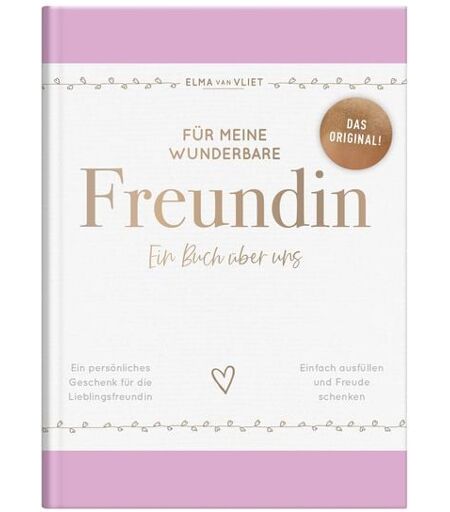 Das Original – wunderschönes Ausfüllbuch als Geschenk für deine beste Freundin Das liebevolle Eintragbuch Für meine wunderbare Freundin von Elma van Vliet ist ein ganz persönliches Geschenk für deine beste Freundin – und eine Gelegenheit, tiefgründige Gespräche anzuregen. Lustige, überraschende und inspirierende Fragen wie „Das ist eines der schönsten Komplimente, die du mir gemacht hast“; „Ich bin sehr stolz auf dich, weil …“ oder „Das mache ich am liebsten mit dir zusammen“ unterstützen dich beim Ausfüllen des Erinnerungsbuchs. Vier Abschnitte begleiten dich beim Festhalten deiner besonderen Erinnerungen: »Erinnerungen an uns beide« – »Über die besondere Person, die du bist« – »Warum du mir wichtig bist« und »Wünsche und Träume für uns zwei«. Ausgefüllt ist das zeitlos schöne Freundebuch ein tolles Geschenk zum Geburtstag, zu Weihnachten oder um deiner besten Freundin Danke zu sagen. Ein ganz persönliches Erinnerungsbuch mit inspirierenden Fragen und Listen zum Ausfüllen und Ankreuzen für Freundinnen Von Elma van Vliet , der Bestseller-Autorin der Erzähl mal-Bücher Viel Platz für Fotos, Erinnerungen und eigene Geschichten Mit Wende-Umschlag, der als Geschenkpapier verwendet werden kann Für meine wunderbare Freundin bietet dir und deiner besten Freundin viel Platz für liebevolle und schöne Momente und die Möglichkeit, sie für immer zu bewahren. ...
