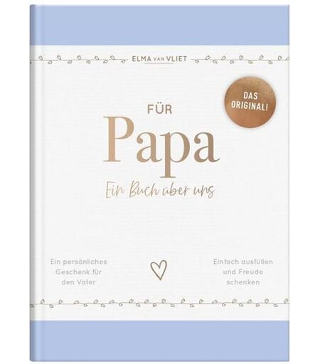 Das Original – ein liebevolles Ausfüllbuch als Geschenk für deinen Papa Ein liebevoll gestaltetes Erinnerungsbuch mit inspirierenden Fragen und Listen zum Ankreuzen Von Elma van Vliet , der Bestseller-Autorin der Erzähl mal-Bücher Viel Platz für Fotos, Erinnerungen und eigene Geschichten Mit Wende-Umschlag, der als Geschenkpapier verwendet werden kann Ausfüllbuch Papa mit 80 Seiten (Maße: 12,1 x 16,4 cm) Das Erinnerungsbuch Für Papa ist ausgefüllt ein wunderbares Geschenk für deinen Vater, zum Beispiel zum Vatertag oder um Danke zu sagen – und eine Gelegenheit, tiefgründige Gespräche anzuregen. Lustige, überraschende und inspirierende Fragen wie „Dies schätze ich besonders an dir“ oder „Diese praktischen Dinge, die du mir beigebracht hast, kann ich heute noch anwenden“ helfen dir beim Ausfüllen des Erinnerungsbuchs. Vier Abschnitte begleiten dich beim Festhalten deiner besonderen Erinnerungen: »Erinnerungen an meine Kindheit« – »Über die besondere Person, die du bist« – »Wofür ich dir dankbar bin« und »Wünsche und Träume für uns beide«. So wird das liebevoll gestaltete Ausfüllbuch zu einem ganz persönlichen Geschenk für deinen Vater. Zum Geburtstag, zum Vatertag oder zu Weihnachten. Für Papa bietet dir und deinem Papa viel Platz für liebevolle und schöne Momente und die Möglichkeit, sie für immer zu bewahren. ...