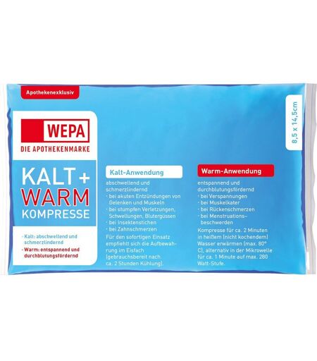 WEPA Kalt & Warm Kompresse 8,5 x 14,5 cm Klein und handlich - optimal zur Anwendung bei kleineren Blessuren wie z. B. Zahnschmerzen, Mückenstichen. Die moderne wiederverwendbare Gel-Kompresse hilft kalt & warm. Kalt-Anwendung: Bewährt bei Schmerzen, Schwellungen und anderen Beschwerdenbei akuten Entzündungen von Gelenken und Muskelnbei stumpfen Verletzungen, Schwellungen, Blutergüssenbei Insektenstichenbei Zahnschmerzen Warm-Anwendung: Zum Entspannen einzelner Partien, wohltuened, schmerzlindernd und durchblutungsfördernd.bei Verspannungenbei Muskelkaterbei Rückenschmerzenbei Menstruationsbeschwerden Im Display. Umweltfreundlich, biologisch abbaubar. ...