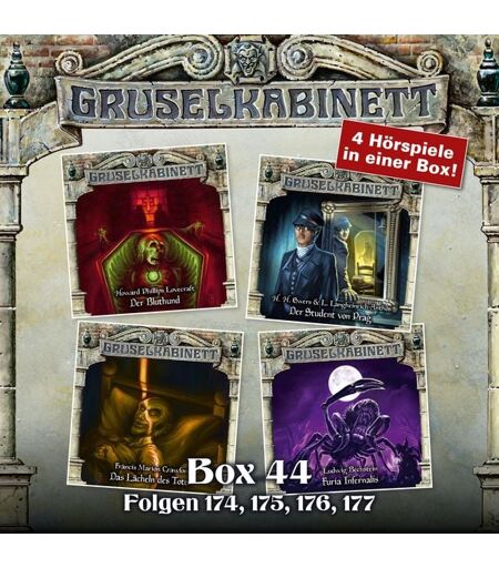 Die Gruselkabinett Box 44 beinhaltet die Hörspiele Der Bluthund, Der Student von Prag, Das Lächeln des Toten, Furia Infernalis ...