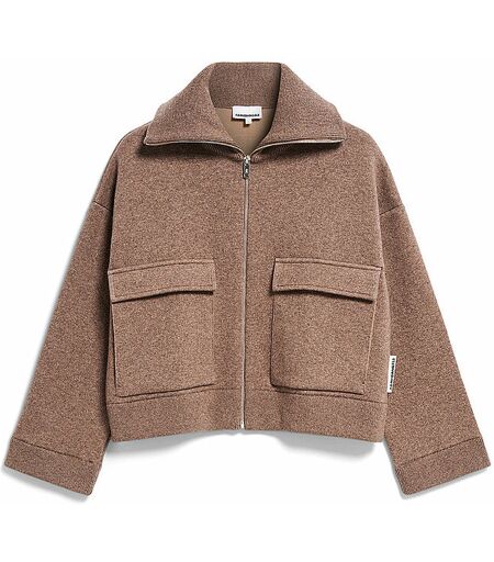 Damen Jacke aus hochwertigem Bio-Baumwoll-Mix mit Woll-Anteil Stehkragen Langarm Überschnittene Schultern Schließt mit Reißverschluss Zwei aufgesetzte Pattentaschen Unifarben Lockere Passform Farbbezeichnung: Cinnamon Dust Melange Material: 77% Baumwolle (bio), 18% Wolle (bio), 5% Polyamid (recycelt) Die Marke Armedangels ist Mitglied der Fair Wear Foundation. ...