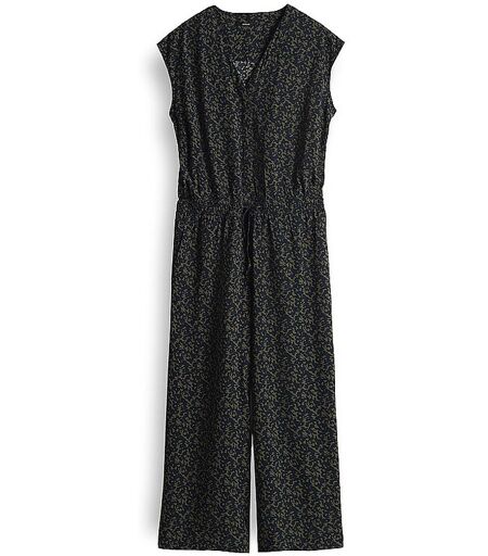 Der sommerliche Jumpsuit ist mit einem dynamischen All-Over Print versehen. Das verkürzte, weite Bein fällt schön fließend und sorgt für optimale Bewegungsfreiheit. Wide Cropped weit am Oberschenkel weiter Beinverlauf lockere Passform verkürzte Länge überschnittene Schulter tiefer V-Ausschnitt leichte Ware fließender Fall kühlender Effekt All-Over-Print französische Taschen elastischer Gummibund Schnürung Passe im Rücken mittellange Knopfleiste Farbbezeichnung: Coal Blue Material: 100% Viskose ...