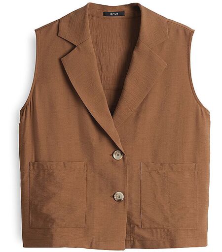 Damen Gilet aus Viskose-Mischung mit dezenter Struktur Reverskragen Ohne Arm Zwei-Knopf-Verschluss Aufgesetzte Eingrifftaschen Passe im Rücken Lockere Passform Verkürzte Länge Unifarben Farbbezeichnung: Golden Oak Material: 90% Viskose, 10% Polyamid ...