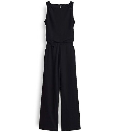 Damen Jumpsuit aus Jersey U-Boot-Ausschnitt Ohne Arm Knopf mit Öse im Rücken Elastischer Gummibund Elastische Schulterpatte mit Raffung Teilungsnaht im rücken Schräge Eingrifftaschen Knitterarm Weiter, gerader Beinverlauf Lockere Passform Unifarben Farbbezeichnung: Black Material: 96% Polyester, 4% Elasthan ...