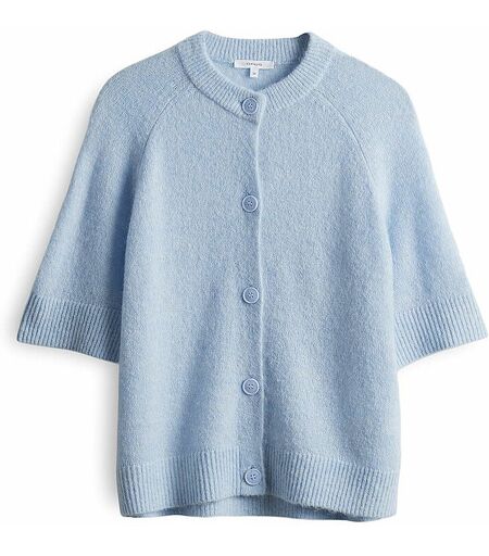 Damen Strickjacke aus weicher Woll-Mohair-Mischung Rundhalsausschnitt Kurze Raglanärmel Schließt mit langer Knopfleiste Gebürstete Oberfläche Breiter Ripp-Saum Lockere Passform Unifarben mit Melange-Effekt Farbbezeichnung: Oxford Blue Material: 46% Polyacryl, 30% Polyamid, 10% Wolle, 10% Mohair, 4% Elasthan ...