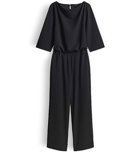 Damen Jumpsuit aus Jersey U-Boot-Ausschnitt 3/4 lange Ärmel Elastischer Bund in der Taille Seitliche Eingrifftaschen Weiter Beinverlauf Unifarben Farbbezeichnung: Black Material: 96% Polyester, 4% Elasthan ...