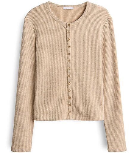 Damen Strickjacke aus Viskose-Mischung mit feiner Rippstruktur Rundhalsausschnitt Schließt mit Knopfleiste Langarm Leicht überschnittene Schultern Gerade Passform Unifarben Farbbezeichnung: Macadamia Material: 52% Viskose, 44% Polyester, 4% Elasthan ...