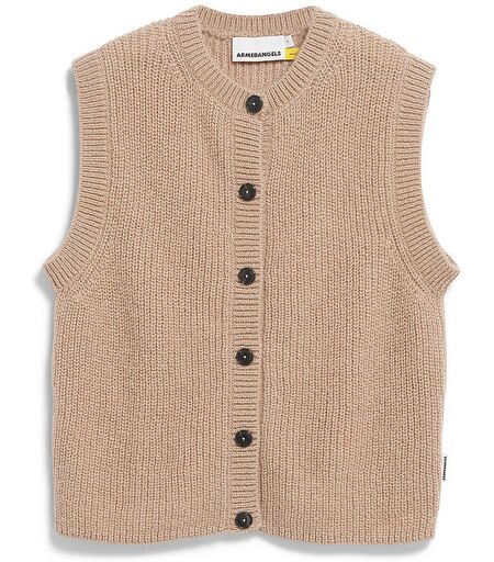 Damen Strickgilet aus Mohair-Woll-Mischung Gerippter Rundhalsausschnitt Ohne Arm Schließt mit Knopfleiste Lockere Passform Unifarben Farbbezeichnung: True Camel Material: 50% Mohair, 50% Wolle (bio) Die Marke Armedangels ist Mitglied der Fair Wear Foundation. ...