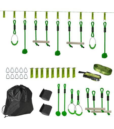 AIYAPLAY 10 m Zipline Kit Kinder Slackline-Set mit 2 Turnringe, 2 Kletterstangen und 3 Spinnerräder für Garten Outdoor Zip Line Kit für 3-6 Jahre Kinder, bis 50 kg