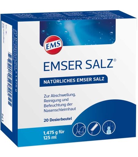 1 g Natürliches Emsersalz wird durch Verdampfen 350 ml reinen Quellwassers gewonnen. Dieses wird der mineralreichen Thermalquelle in Bad Ems entnommen. 1 Emser Salz im Beutel 1,475g enthält 1,475 g natürliches Emser Salz.GegenanzeigenEmser Salz im Beutel 1,475g darf nicht angewendet werden bei: