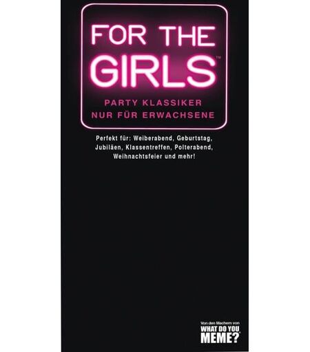 For the girls Lasst die Jungs links liegen und taucht ein in einen turbulenten Mädelsabend: FOR THE GIRLS ist wilder Mix aus allem was das Herz begehrt. Schachtel auf und rein ins Vergnügen: Wahrheit oder Pflicht, Flaschendrehen oder Never Have I Ever - bei diesem Best-Of-Partyspiele bleibt keine Kehle trocken und kein GEheimnis geheim. Würfel, Karte vorlesen und Aufgabe erfüllen. Wer am Ende die meisten Punkte hat, gewinnt! ...