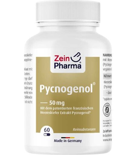 Anwendungsgebiet von Pycnogenol® 50mg von ZEINpharmaPycnogenol® 50mg von ZEINpharma sind ein Nahrungsergänzungsmittel mit Meereskiefer Extrakt (Pinus pinaster (Pycnogenol®) mit 70 % Procyanidinen in veganen Kapseln.