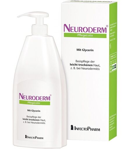 Anwendungsgebiet von Neuroderm PflegelotioNeuroderm Pflegelotio ist eine Lotion vom Wasser-in-Öl-Typ (W/O-Typ) für leicht trockene bis trockene Hautbereiche. Mit einem Lipidanteil von 25 % zieht sie besonders schnell ein, lässt sich leicht verteilen und hinterlässt ein angenehmes Hautgefühl. Zudem wird die Schutzbarriere der Haut gestärkt. Der hohe Glycerin-Anteil in Neuroderm Pflegelotio spendet der Haut Feuchtigkeit.Wirkstoffe / Inhaltsstoffe / ZutatenInhaltsstoffe von Neuroderm Pflegelotio :