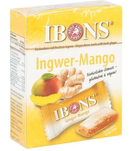 Anwendungsgebiet von Ibons Ingwer Mango Box KaubonbonsDie ganze Süße der Mango gewürzt mit der leichten Schärfe des Ingwers, perfekt vereint in einem Kau-Genuss. IBONS Kaubonbons sind immer wieder gut zu überraschen und begeistern mit ganz besonderen Nuancen. Unsere Ingwer- und Mangobonbons sind ein Genuss für die Sinne. Die Kombination aus Mango und Ingwer liefert viele wichtige Inhaltsstoffe und sorgt dafür, dass das Wohlbefinden von Körper und Geist gesteigert wird. IBONS Bonbons mit Mango und Ingwer sind kleine Kostbarkeiten, die sich für den Alltag und für die Reise empfehlen.Wirkstoffe / Inhaltsstoffe / ZutatenZutaten von Ibons Ingwer Mango Box Kaubonbons
