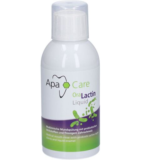 ApaCare OraLactin Liquid schützt vor Karies und Parodontitis und schmeckt angenehm frisch. Zahnoberflächen werden mit einem Schutzfilm überzogen und geglättet; Empfindlichkeiten anhaltend reduziert. Präbiotika stabilisieren und unterstützten die Einstellung einer gesunden Mundflora. Hyaluronsäure hält die Mundschleimhaut angenehm feucht und pflegt die Mundschleimhaut auch bei Mundtrockenheit. Alkoholfreie medizinische Mundspülung, zur Daueranwendung geeignet. Eine regelmäßige Anwendung unterstützt ein gesundes Mundmikrobiom wie auch wichtige Mundbakterien, die durch von Ihnen gebildete körpereigene Botenstoffe zur Senkung des Blutdruckes und zur Prävention von Diabetes beitragen. Bereits nach wenigen Anwendungen möchte man auf die angenehm glatten Zahnoberflächen durch den Schutzfilm aus flüssigem Zahnschmelz und die geschmeidige Mundschleimhaut nicht mehr verzichten. Die wohlschmeckende Formulierung sorgt für einen anhaltend frischen Geschmack und Atem. Mundgeruch und Zahnfleischentzündungen werden reduziert. Auch Zahnfleischblutungen kann wirksam vorgebeugt werden. Anwendung: Für Erwachsene und Kinder ab 6 Jahren. Vor Gebrauch bitte kurz schütteln. 2-mal täglich gründlich spülen (unverdünnt, ca. 30 Sekunden). Nicht schlucken. Enthält Natriumfluorid (250 ppm F– ). Zusammensetzung: AQUA, GLYCERIN, PROPYLENE GLYCOL, ARGININE, POTASSIUM NITRATE, HYDROXYAPATITE, CELLULOSE, CELLULOSE GUM, AROMA, ACACIA SENEGAL GUM, LACTOBACILLUS FERMENT, HYALURONIC ACID, SODIUM FLUORIDE, COCAMIDOPROPYL BETAINE, MENTHA SPICATA HERB OIL, SODIUM SACCHARIN, BENZYL ALCOHOL, BENZOIC ACID, DEHYDROACETIC ACID ...