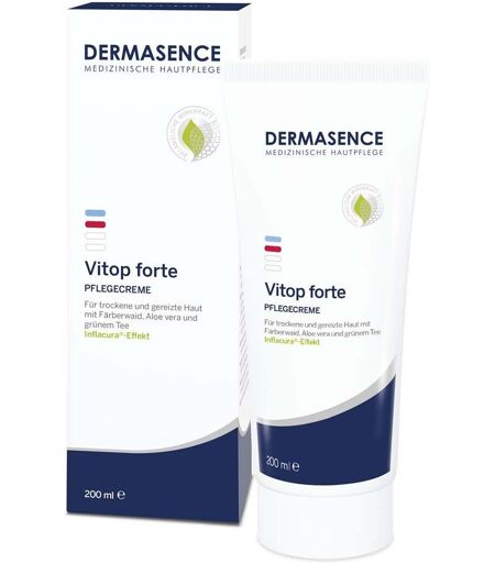 cDERMASENCE® Vitop forte CremeSchutzschirm bei trockener Haut mit der Kraft aus der Natur Bei sehr trockener, gereizter und juckender Haut ist regelmäßige Pflege angeraten, um nachhaltige Ergebnisse zu erzielen. DERMASENCE® Vitop forte mit dem einzigartigen, natürlichem Wirkkomplex aus Färberwaid, Aloe Vera und Grünem Tee hat sich aufgrund seiner hautberuhigenden und entzündungshemmenden Wirkung vielfach bewährt. Die Pflegecreme mindert Hautreizungen, kann der Entstehung von Juckreiz und Entzündungen vorbeugen und eignet sich ideal zur begleitenden Pflege bei Neurodermitis.Mittels der nachhaltigen Tuben-Technik ist die Creme einfach zu dosieren und die Tube kann nahezu restlos entleert werden. DERMASENCE® Vitop forte ist frei von Duft- und Farbstoffen und kann dank guter Hautverträglichkeit auch langfristig angewendet werden.Kann Juckreiz & Entzündungen vorbeugen Für extrem trockene und beanspruchte Haut Mit einzigartigem Wirkkomplex Beruhigt trockene und empfindliche Haut Reduziert Rötungen Besonders hautverträglich, auch für Kinder geeignet Pflanzliche Inhaltsstoffe DERMASENCE® Vitop forte enthält den Extrakt aus Färberwaid, einer seit Jahrhunderten in der Heilmedizin bewährte Arzneipflanze, die nach langjähriger dermatologischer Forschung und Entwicklung für die Pflegecreme wiederentdeckt wurde. Ihre hautberuhigende und entzündungshemmende Wirkung bildet in Kombination mit Aloe Vera und Grünem Tee einen atmungsaktiven Schutzfilm, der die Haut vor mechanischen Belastungen schützt und Irritationen verhindert. Der einzigartige Aktiv-Wirkkomplex der Intensivpflege stimuliert die hauteigene Regeneration, kann Ent- zündungsprozessen vorbeugen und den Teufelskreis“ aus Jucken und Kratzen wirksam unterbrechen.ANWENDUNGSEMPFEHLUNG: DERMASENCE® Vitop forte wird bei Bedarf mehrmals täglich auf die betroffenen Hautstellen aufgetragen. Der praktische Drehverschluss erleichtert die Anwendung: Einfach drehen, auf den markierten Bereich der Tube drücken und gewünschte Creme-Menge entnehmen. Auch für die langfristige Anwendung geeignet.BEI NEIGUNG ZU NEURODERMITIS DERMASENCE® Vitop forte hat sich als begleitende Pflege bei chronischen Hauterkrankungen wie Neurodermitis bewährt. Durch die Stärkung der Schutzfunktion der Haut können schubfreie Phasen verlängert werden. Im Gegensatz zu Salben mit Cortison, das bei längerer Nutzung ein breites Spektrum an Nebenwirkungen aufweisen kann, eignet sich die Pflegecreme auch zur langfristigen Anwendung.FÜR KINDER AB 3 JAHREN Von Neurodermitis sind auch Kinder betroffen, bei denen sich die chronische Hautkrankheit meist durch sehr trockene, schuppende Haut und Ekzemen an den Vorderseiten der Arme und Rückseiten der Beine äußert. Aufgrund der guten Hautverträglichkeit der pflanzlichen Wirkstoff-Kombination ist DERMASENCE® Vitop forte zur Intensivpflege bereits für Kinder ab drei Jahren geeignet.MEDIZINISCHE HAUTPFLEGE In enger Zusammenarbeit mit Hautärzten entwickelt DERMASENCE® seit Jahrzehnten medizinische Produkte... ...