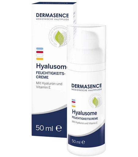 Anwendungsgebiet von Dermasence Hyalusome FeuchtigkeitscremeDie Anti-Aging-Pflege hydratisiert mit Hyaluron, Panthenol und Glycerin trockene, reifere Haut und beugt Elastizitätsverlusten und Faltenbildung vor. Avocadoöl und Sheabutter stabilisieren die Hautbarriere. Die leichte Textur hinterlässt ein gepflegtes und glatteres Hautgefühl.Wirkstoffe / Inhaltsstoffe / ZutatenInhaltsstoffe von Dermasence Hyalusome Feuchtigkeitscreme:AQUA, PERSEA GRATISSIMA (AVOCADO) OIL, GLYCERIN, GLYCERYL STEARATE CITRATE, PENTYLENE GLYCOL, OCTYLDODECANOL, GLYCERYL STEARATE, BUTYROSPERMUM PARKII (SHEA) BUTTER, CETEARYL ALCOHOL, CETEARYL ISONONANOATE, TOCOPHERYL ACETATE, RICINUS COMMUNIS (CASTOR) SEED OIL, PANTHENOL, SODIUM HYALURONATE, DICAPRYLYL ETHER, BIS-DIGLYCERYL POLYACYLADIPATE-2, HYDROXYACETOPHENONE, XANTHAN GUM, CARRAGEENAN, HELIANTHUS ANNUUS (SUNFLOWER) SEED OIL, DEHYDROACETIC ACID, TOCOPHEROL, RIBOFLAVIN, LACTIC ACID, ETHYL FERULATE, CITRIC ACID, HUMULUS LUPULUS (HOPS) EXTRACT, PARFUM.GegenanzeigenBei bekannter Überempfindlichkeit gegenüber einem der Inhaltsstoffe sollte dieses Produkt nicht angewendet werden.DosierungAnwendungsempfehlung von Dermasence Hyalusome Feuchtigkeitscreme: