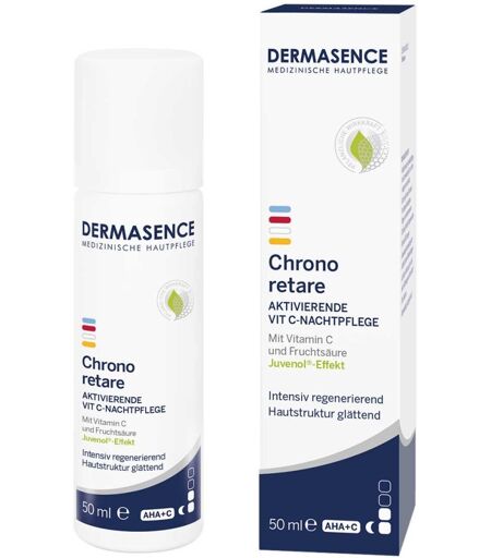 Anwendungsgebiet von Dermasence Chrono Retare Aktiv.Vit-C NachtpflegeDermasence Chrono Retare Aktiv.Vit-C Nachtpflege ist eine Intensive Nachtpflege mit Juvenol®-Effekt, die der Haut hilft sich zu regenerieren.
