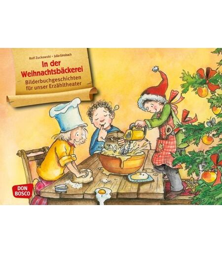 Empfohlen für Hörer ab 3 Jahren. In diesem Weihnachtslied steckt eine ganze Geschichte: In der Weihnachtsbäckerei Gemeinsam singen, Plätzchen backen und die Vorfreude genießen: Manche Dinge sind einfach untrennbar mit Weihnachten verbunden - so wie das Lied „In der Weihnachtsbäckerei“ von Rolf Zuckowski, das die Geschichte eines kunterbunten Tags im Advent erzählt. Julia Ginsbach hat das beliebte Kinderweihnachtslied für das Don Bosco Kamishibai liebevoll und detailliert illustriert. Weihnachten im Kindergarten: mit dem beliebten Kinderlied durch die Adventszeit Gemeinsam Backen und die Küche mit Duft erfüllen: Die 9 Kamishibai Bildkarten laden zum Entdecken und Mitmachen ein Zuhören, singen, nacherzählen: Kinder ab drei Jahren lernen ganz nebenbei den Text von „In der Weihnachtsbäckerei“ Kreative Sprachförderung mit dem Erzähltheater: Welche Zutaten sind auf den Bildern zu sehen? Wer findet das Rezept? Mit dem Kamishibai Weihnachten erleben: singen und backen, zuhören und erzählen „In der Weihnachtsbäckerei“ ist eine kleine Erzählung, verwandelt in ein fröhliches Weihnachtslied. Perfekt geeignet für das Erzähltheater, in dessen Rahmen nacheinander die bunten Bildkarten gezeigt werden. Schritt für Schritt erarbeiten Lehrer, Erzieher & Pädagogen so mit den Kindern die einzelnen Strophen – und holen sich zugleich Appetit auf Weihnachtsgebäck! ...