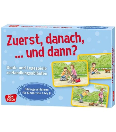Was passiert hier? Lernspiel für Logik, Aufmerksamkeit und Konzentration Was machen Kinder zuerst, wenn sie einen Schneemann bauen wollen? Welche Aktionen sind nötig, um in der Eisdiele das Lieblingseis zu bekommen? Für dieses Logikspiel wurden kleine Geschichten aus dem Kinderalltag in drei oder vier Handlungsschritte aufgeteilt. Ziel des Spieles ist es, die richtige Reihenfolge für die Bildkarten zu finden – das fördert logisches Denken und die visuelle Wahrnehmung. Logische Reihenfolgen erkennen und zusammensetzen: 9 Bildgeschichten auf 32 Karten Denkvermögen trainieren, Ausdruck verbessern: viele Spielvariationen möglich Geschichten verstehen und mündlich oder schriftlich nacherzählen Entwickelt für den Einsatz in Kita, Grundschule und Sonderpädagogik Inkl. Begleitheft mit Spielanleitung für Erzieher:innen, Pädagogen und Pädagoginnen Immer schön der Reihe nach: Mini-Geschichten in logische Reihenfolgen bringen Strukturiert und logisch denken, Handlungs- und Ereignisketten erkennen und das Ergebnis mündlich oder schriftlich nacherzählen: Die alltäglichen Vorkommnisse auf den Karten sind den Kindern geläufig und können daher leicht in schlüssige Handlungszusammenhänge gebracht werden. Sollte doch einmal eine Geschichte Schwierigkeiten bereiten, hilft eine Impulsfrage aus dem Begleitmaterial den Kindern auf die Sprünge! Die zwei unterschiedlichen Schwierigkeitsgrade sorgen zusätzlich dafür, dass gerade zu Beginn kein Frust entsteht – so machen Lern- und Konzentrationsspiele Spaß! ...