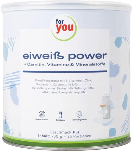 Das for you eiweiß power ist ein hochwertiges 4-Komponenten Eiweiß-Konzentrat mit multifunktionellen Eigenschaften. Es ist eine Mischung aus 4 sorgfältig ausgewählten, biologisch sehr hochwertigen Proteinquellen. Es ist gut löslich, leicht verdaulich, fettarm und wohlschmeckend. Durch die Kombination verschiedener Eiweißquellen hat das for you power eiweiß eine ausgewogene Bilanzierung aller Aminosäuren.