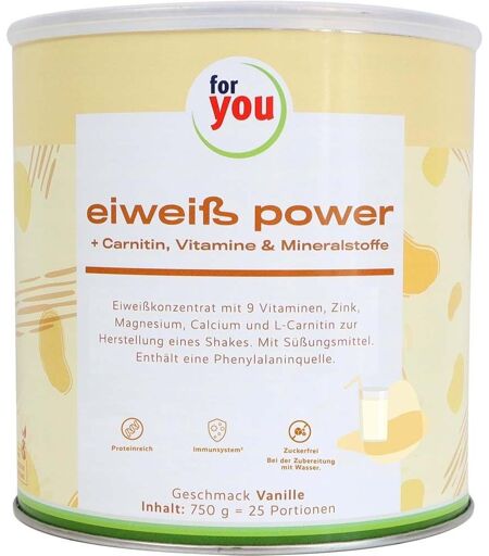Bitte achten Sie auf eine abwechslungsreiche und ausgewogene Ernährung und gesunde Lebensweise.For you eHealth Eiweiß Power Vanille MEHRKOMPONENTENEIWEISS: Das for you 4-Komponenten Power Eiweiß mit einer ausgewogenen Bilanzierung aller Aminosäuren ist als Sportnahrung und Training Eiweißshake geeignet. Es ist fettarm, gut löslich sowie leicht verdaulich. Chemical Score von 156. for you 4-KOMPONENTEN-Eiweißpulver: Durch die vier hochwertigen Eiweißquellen: Milchprotein, Molkenprotein, Sojaprotein Isolat und Hühnerei-Eiweißpulver ist das Pulver gut löslich, leicht verdaulich, fettarm und wohlschmeckend. ZUGESETZTE NÄHRSTOFFE: Das Eiweißpulver ist mit Vitaminen und Mineralstoffen sowie mit mikroverkapseltem L-Carnitin angereichert. Das Fitness Pulver punktet vor allem durch einen Proteinanteil von 80%. GEHEIMNIS EIWEIß : Unser Proteinpulver ist nach "Die neue Diät von Dr. Strunz" entwickelt, setzt nur auf beste und reinste Rohstoffe. Perfekt geeignet für eine Diät nach dem Strunz-Low-Carb-Kochbuch. for you DEIN GESUNDHEITSPARTNER: Wir arbeiten immer mit lizenzierten Markenrohstoffen mit bester Bioverfügbarkeit und minimieren die Verwendung von Zusatzstoffen. Unsere Produkte sind frei von Schwermetallen & Gentechnik. Alle unsere Produkte werden in HACCP- und GMP-zertifizierten Betrieben in Deutschland hergestellt. for you Power Eiweiß nach Strunz Vanille Das Eiweiß-Konzentrat aus sorgfältig ausgewählten, biologisch hochwertigen verschiedenen Proteinquellen ist gut löslich, leicht verdaulich, fettarm und wohlschmeckend. Durch die Kombination verschiedener Eiweißquellen hat das Power Eiweiß eine ausgewogene Bilanzierung aller Aminosäuren. Das Mehrkomponenten Protein for you eiweiß power setzt sich aus diesen vier hochwertigen Eiweißkomponenten zusammen: Milcheiweiß wird aus frischer pasteurisierter Magermilch hergestellt wird. Innerhalb des Herstellungsprozesses wird das Casein mit Säure ausgefällt, anschließend neutralisiert und sprühgetrocknet. Das im for you eiweiß power verwendeten Milcheiweiß ist ein spezielles Milchprotein, welches durch das Mischen mit Milch besonders cremig in der Konsistenz wird. Soja-Eiweiß ist eines der wenigen pflanzlichen Proteine, welches ein vollständiges Aminosäurenspektrum besitzt. Innerhalb des Herstellungsprozesses werden die Sojabohnen entölt und die Kohlenhydrate extrahiert. Molkeneiweiß Konzentrat des for you eiweiß power ist ein instantisiertes Molkenprotein Konzentrat, welches aus frischer Süßmolke der Käseverarbeitung entsteht. Hühnereieiweiß enthält bestimmte Aminosäuren, welche nur limitiert in den drei anderen Eiweißpulver-Komponenten enthalten sind. Zusätzlich enthält das Produkt mikroverkapseltes L-Carnitin (500 mg pro Portion). for you Power Eiweiß Im for you eiweiß power stecken außerdem viele wichtige Vitamine und Mineralstoffe. Neben Calcium und Magnesium ist Zink wichtiger Bestandteil der Rezeptur. Eine hochwertige und sorgfältig ausgewählte Mischung aus B-Vitaminen, Vitamin C und... ...