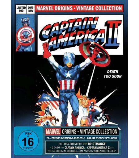 "Nach DER UNGLAUBLICHE HULK folgten die Origins-Geschichten von Dr. Strange und Captain America in TV-Spielfilmen. DR. STRANGE (BD): Visionen gehören für Psychiater Dr. Stephen Strange (Peter Hooten) zum Klinikalltag. Als er selbst eines Tages davon befallen wird, werden sie für ihn zur brutalen Realität. Er gerät in einen Strudel von Ereignissen, bei denen Wirklichkeit und Traum verwischen. Urplötzlich hat er übermenschliche Kräfte, die ihm völlig neue Dimensionen eröffnen. Gemeinsam mit dem alten Wissenschaftler Lindmer, der auf der Suche nach einem mittelalterlichen Geheimnis ist, gerät Strange Schritt für Schritt in eine neue Welt auf ein Schlachtfeld, auf dem sich die Mächte von Gut und Böse im ewigen Konflikt befinden. CAPTAIN AMERICA (DVD): Der Marvel-Held in rot-weiß-blau Captain America wurde 1940 von Jack Kirby und Joe Simon erschaffen. 1979 erweckte diese Origin-Story in der ersten Realverfilmung des klassischen Stoffs den Superhelden neu zum Leben. Steve Rogers (Reb Brown), ein todesmutiger Motocross-Fahrer, wird nach einem Unfall durch ein neues, von seinem verstorbenen Vater entwickelten Serum gerettet. Es verbessert Steves Sinne und Reflexe und verleiht ihm Superkräfte. Im Auftrag der Regierung zieht ""Captain America"" mit seinem legendären Schutzschild und einem Motorrad mit Raketenantrieb in den Kampf gegen die Mächte des Bösen ... CAPTAIN AMERICA II – DEATH TOO SOON (DVD, OmU): Terrorist General Miguel (Christopher Lee) entführt Professor Ian llson. Dieser entwickelt eine unheimliche Chemikalie, die Menschen rasant altern lässt. Mit dieser Massenvernichtungswaffe will Miguel Lösegeld in Millionenhöhe erpressen. Nur Steve Rogers, den ein Serum zum Superhelden Captain America verwandelt hat, kann ihn stoppen. Im Namen von Gerechtigkeit und Freiheit bekämpft er mit seinem neugetunten, flugfähigen Motorrad den terroristischen Schurken. DR. STRANGE (Blu-ray Disc), CAPTAIN AMERICA I (DVD), CAPTAIN AMERICA II - erstmals in Deutschland (OmU) (DVD). Marvel-Origins-Vintage-Collection: Im limitierten Mediabook - nur 500 Stück. 56-seitiger Buchtteil von Tobias Hohmann zur Entstehungsgeschichte der Marvel-Helden und den Verfilmungen Laufzeit DVD Teil 1: ca. 94 Minuten / Teil 2 ca. 93 Minuten / Blu-ray ca. 94 minuten" ...