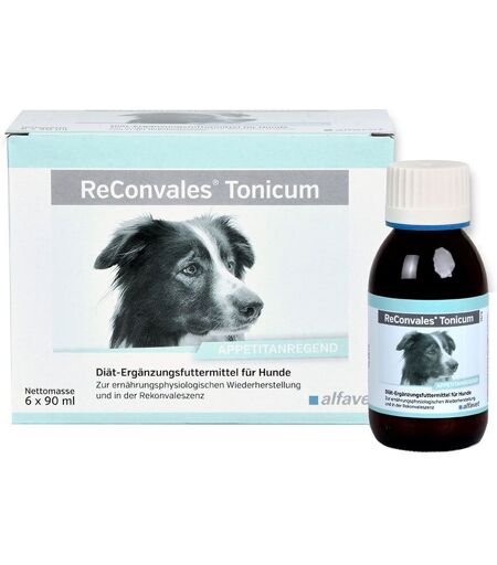 Diät-Ergänzungsfuttermittel zur Gabe in der Rekonvaleszenz und bei Untergewicht für Hunde ReConvales Tonicum von Alfavet unterstützt die Genesung bei Hundenliefert in flüssiger Form lebenswichtige und schnell verfügbare Aminosäuren, Elektrolyte, Vitamine, Spurenelemente, Mineralien und Energie direkt in den Magen-Darmtrakt, das größte Immunorgan des Körpers. Es kann den schnellen Genesungsprozess unterstützen, ist leicht aufzunehmen und verfügt über eine herausragende Akzeptanz ohne den Verdauungstrakt zusätzlich zu belasten.Anwendungsbereiche:nach Operationen: ReConvales Tonicum eignet sich durch die ausgewogenen Zusammensetzung besonders gut zur Unterstützung bei verminderter Nahrungsaufnahme oder als Ergänzung des Tagesbedarfes. schlechter Allgemeinzustand: Durch Zufuhr wertvoller Zusammensetzung wie Elektrolyte, Vitamine, Spurenelemente und Mineralien wird der Stoffwechsel angeregt und der körperliche Allgemeinzustand kann verbessert werden. Zahn-,Maul- und Rachenprobleme: Durch die flüssige Form können lebenswichtige Nährstoffe vom Tier auch bei schmerzhafter Erkrankung der Maulhöhle aufgenommen werden. geriatrischeTiere/Altersschwäche: Die Aufnahme in flüssiger Form schont den Vedauungstrakt und entlastet gleichzeitig den Verdauungsvorgang. Die wertvollen Zusammensetzung von ReConvales Tonicum können die Aktivität positiv unterstützen. Appetitlosigkeit/Nahrungsverweigerung: Durch die hohe Akzeptanz von Reconvales Tonicum wird der Hund zur Rückkehr zum natürlichen Fressverhalten animiert. Verdauungsprobleme: Die Aufnahme in flüssiger Form entlastet den Verdauungsapparat und sorgt für die Zufuhr wertvoller Zusammensetzung, die direkt im Magen-Darmtrakt verarbeitet werden. Zusammensetzung: Trinkwasser, pflanzliche Nebenerzeugnisse, Fleisch und tierische Nebenerzeugnisse, Öle und Fette, Milch und Molkereierzeugnisse, Mineralstoffe, HefenZusammensetzung in %: Rohprotein 2.50 Rohfett 2.20 Rohfaser 0.60 Rohasche 1.30Analytische Bestandteile: Vitamin A (IE) 1100.00 Vitamin D3 (IE) 110.00 Vitamin E (mg) 30.00 Vitamin B2 (mg) 3.50 Vitamin B6 (mg) 6.00 Biotin (mg) 50.00 Cholinchlorid (mg) 200.00 Eisen (mg) 6.00 Mangan (mg) 1.00 Zink (mg) 3.00 Vitamin B1 (mg) 2.50Fütterungsempfehlung: bei einem Gewicht bis 15 kg 1/2 bis 1 Flasche/Tag über 15 kg 1 Flasche/Tag als Einmalgabe oder über den Tag verteilt.empfohlene Fütterungsdauer: mindestens 6 Tage. Bei längerer Anwendung fragen Sie bitte Ihre Tierärztin der Ihren Tierarzt. ...
