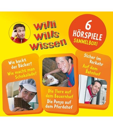 Willi Weitzel ist mit Leib und Seele Reporter für die nach ihm benannten Sendereihen Willi wills wissen. Er stellt die richtigen Fragen, um ein Thema zu erfassen, betrachtet die Dinge auch mal von der anderen Seite und bringt selbst komplizierte Sachverhalte auf den Punkt. Mit den Hörspielen Folge 1: Wie backt der Bäcker? / Wie macht man Schokolade? Folge 2: Die Tiere auf dem Bauernhof / Die Ponys auf dem Pferdehof Folge 3: Sicher im Verkehr / Auf dem Bahnhof ...