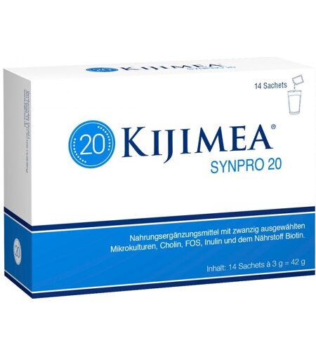 Wirkungsweise von Kijimea Synpro 20 PulverKijimea Synpro 20 Pulver ist ein Nahrungsergänzungsmittel mit 20 ausgewählten Mikrokulturen, die in der natürlichen Darmflora des Menschen vorkommen. Zusätzlich enthält Kijimea Synpro 20 Pulver Synpro 20 Cholin, FOS, Inulin sowie Biotin, das zur Erhaltung normaler Schleimhäute beiträgt.Wirkstoffe / Inhaltsstoffe / ZutatenKijimea Synpro 20 Pulver enthält: