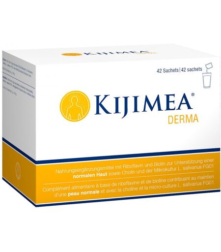 und Biotin, die zur Erhaltung einer normalen Haut beitragen. Zusätzlich enthält Kijimea® Derma Cholin, FOS, Inulin sowie die einzigartige Mikrokultur L. salivarius FG01.