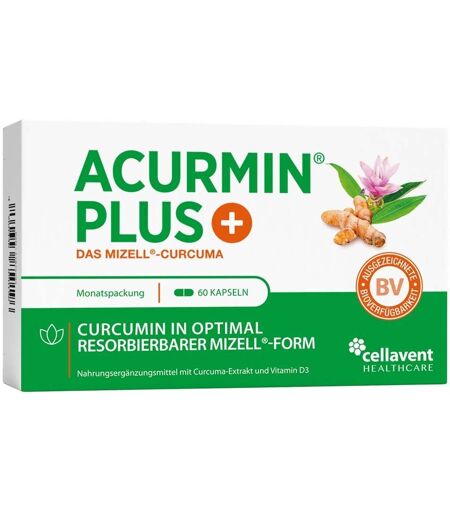 Nahrungsergänzungsmittel sind kein Ersatz für eine ausgewogene und abwechslungsreiche Ernährung und eine gesunde Lebensweise. Acurmin PLUS – 185x bessere Curcumin Aufnahme Acurmin PLUS Kurkuma Kapseln enthalten hochwertiges Curcumin in einer innovativen Mizell-Formulierung, die eine 185x bessere Aufnahme im Vergleich zu herkömmlichen Kurkuma Kapseln ermöglicht. So wird der wertvolle Pflanzenstoff optimal vom Körper aufgenommen und sorgt für einen konstanten Curcumin-Spiegel bis zu 24 Stunden. Warum Acurmin PLUS? Original Mizell Curcuma Kapseln mit 95 % Curcuma-Extrakt 2 Kapseln entsprechen 10.000 mg Kurkuma Pulver pro Tagesdosis 185x bessere Aufnahme im Vergleich zu herkömmlichen Kapseln Flüssiger Curcumin Kern in kleinen Softgel-Kapseln Wissenschaftlich entwickelt mit Oncotrition, einer Ausgründung des Fraunhofer Instituts Produktion nach pharmazeutischen Standards in Deutschland Laborgeprüfte Qualität (C-14 Methode) Sichere, luftdichte Blisterverpackung Maximale Bioverfügbarkeit für nachhaltige Curcumin-Aufnahme Curcumin, der wertvolle Inhaltsstoff aus Kurkuma, ist von Natur aus schwer vom Körper aufzunehmen, da es fettlöslich ist und sich in der wässrigen Umgebung des Körpers schlecht löst. Acurmin PLUS nutzt die innovative Mizell-Technologie: Das Curcumin wird in winzige Trägerstrukturen eingebettet, die sowohl wasser- als auch fettlöslich sind. Dadurch wird das Curcumin wasserlöslich und 185-mal besser bioverfügbar, sodass es optimal vom Körper aufgenommen werden kann und einen konstanten Curcumin-Spiegel für bis zu 24 Stunden aufrechterhält. Deine Vorteile: Maximale Aufnahme: Mizell-Technologie macht Curcumin wasserlöslich und erhöht die Bioverfügbarkeit. Stabiler Effekt: Konstanter Curcumin Spiegel über 24 Stunden. Einfache Einnahme: Kleine, leicht zu schluckende Softgel-Kapseln für eine unkomplizierte Anwendung. Zutaten: Curcumin (min 55mg), Vitamin D (14µg). Zusammensetzung: Emulgator Polysorbat 80, Gelatine (Kapsel), Glycerin (Feuchthaltemittel), Curcuma-Extrakt, Cholecalciferol (Vitamin D). Nährstoffe pro Kapsel pro Tagesmenge (2 Kapseln) % NRV* Curcumin 27,5 mg 55 mg ** Vitamin D 37 µg 14 µg 280 % * Nutrient Refernce Values (Referenzmenge nach EU-Lebensmittelverordnung) ** Keine Empfehlung der Europäischen Union (EU) vorhanden Verzehrempfehlung: Täglich zwei Kapseln. Vorzugsweise jeweils 1 Kapsel morgens und abends zu den Mahlzeiten. Kapseln nicht lutschen oder kauen. Hinweis: Die angegebene empfohlene tägliche Verzehrmenge darf nicht überschritten werden. Aufbewahrung: Kühl (6-25 °C) und lichtgeschützt lagern. Außerhalb der Reichweite von kleinen Kindern aufbewahren. Nettofüllmenge: 60 Kapseln = 43,3 g Herstellerdaten: Cellavent Healthcare GmbH Am Trippelsberg 43 D-40589 Düsseldorf ...