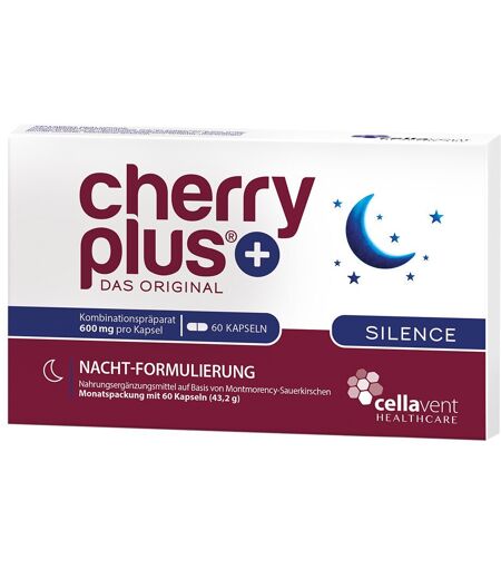Anwendungsgebiet von Cherryplus Das Original Silence KapselnCherryplus Das Original Silence Kapseln sind ein Nahrungsergänzungsmittel auf Basis von Montmorency-Sauerkirschen mit Magnesium, Zink und Vitamin B6. Magnesium und Vitamin B6 tragen zu einer normalen psychischen Funktion bei und fördert eine normale Funktion des Nervensystems. Zink schützt zusätzlich die Zellen vor oxidativem Stress.
