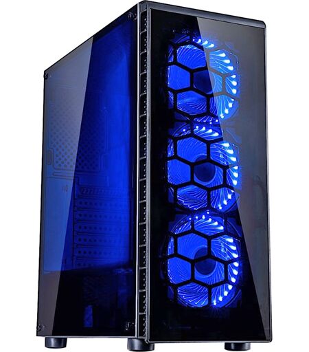 Das Inter-Tech CXC2 besitzt eine mit drei blauen Argus L-12025 LED-Lüftern beleuchtete Front, was das Gehäuse zu einem wahren Eye-Catcher macht. Die Front besteht aus Tempered Glass, mit trendigem Honeycomb-Muster dahinter, und wird durch ein Fensterseitenteil aus Acrylglas ergänzt. Platz und Anschlussmöglichkeiten für weitere Lüfter, eine wahlweise 120 mm oder eine 240 mm Wasserkühlung sowie diverse Festplatten finden sich im geräumigen Innenraum des CXC2 vor. Im Deckel des Gehäuses sowie unterhalb des Netzteils befindet sich ein herausnehmbarer Staubfilter. Auf dem Deckel befinden sich außerdem die USB 2.0, USB 3.2 und HD-Audio Frontanschlüsse sowie sämtliche Schalter. Für die 3,5" Festplatten sind spezielle Führungsschrauben dabei, sodass man nur auf einer Seite mit dem Schraubendreher ansetzen muss. Auf dem separaten Netzteiltunnel finden zudem zwei optionale 120 mm Lüfter ihren Platz, die für zusätzliche Entlüftung des darunter verbauten Netzteils sorgen können. ...