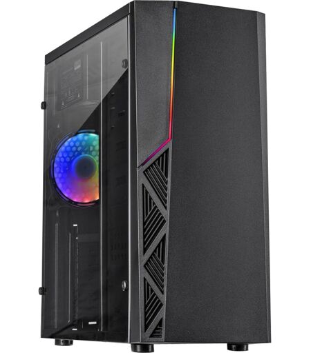 Das B-02 überzeugt sowohl durch den serienmäßig installierten 120-mm RGB-Lüfter auf der Rückseite, als auch durch den integrierten RGB LED-Streifen in der Front. Beide RGB-Elemente lassen sich mittels des Reset-Tasters in ihren Farben und Effekten steuern. Das Fensterseitenteil aus Acryl bietet Einblicke in das Innenleben des Gehäuses und setzt die verbaute Hardware gekonnt in Szene. Ein USB 3.2 sowie zwei USB 2.0 Frontanschlüsse sind im oberen Teil der Front angebracht und bedienerfreundlich zu erreichen. Platz für bis zu zwei weitere Lüfter und Einbaumöglichkeiten für bis zu 3x 3,5" HDD und 2x 2,5" SSD runden das Gesamtpaket ab. ...