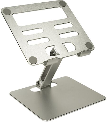 Der TBS-100 ist ein kompakter Notebook-Ständer aus Aluminium, der für Tablets und Notebooks von 27,94 cm (11") - 35,56 cm (14") geeignet ist. Er lässt sich stufenlos in der Höhe verstellen und neigen und trägt aufgrund seines Open-Frame-Designs passiv zur Kühlung des Notebooks bei. Dank der kompakten Abmessungen passt der TBS-100 auf nahezu alle Arbeitsflächen und ist zusammengefaltet gerade mal 140x149x25 mm groß, was ihn zu einem perfekten Begleiter in der Notebook-Tasche macht. Gummiauflagen schützen zudem das aufliegende Notebook sowie die Arbeitsfläche vor Kratzern und verhindern zudem lästige Vibrationen, die durch die Arbeit mit dem Notebook entstehen können. ...
