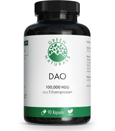 - davon Diaminoxidase (DAO): 100.000 HDU / 300.000 HDUGegenanzeigenBei bekannter Überempfindlichkeit gegenüber einen der oben genannten Inhaltsstoffe sollte das Produkt nicht angewendet werden.DosierungVerzehrempfehlung von Green Naturals DAO 100 mg vegan zum Histaminabbau:
