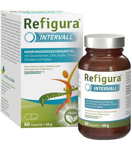 Anwendungsgebiet von Refigura Intervall KapselnRefigura Intervall Kapseln ist ein Nahrungsergänzungsmittel mit Glucomannan, Zink, Kupfer, Chrom, Grüntee und Ingwer. Glucomannan trägt im Rahmen einer kalorienarmen Ernährung zu Gewichtsverlust bei. Chrom unterstützt die Aufrechterhaltung eines normalen Blutzuckerspiegels. Zink trägt zu einem normalen Kohlenhydratstoffwechsel und Fettsäurestoffwechsel bei. Kupfer unterstütz einen normalen Energiestoffwechsel und trägt zur Erhaltung von normalem Bindegewebe bei.Wirkstoffe / Inhaltsstoffe / ZutatenZutaten von Refigura Intervall Kapseln:Glucomannanreicher Konjak-Wurzel Extrakt, Hydroxypropylmethylcellulose(Kapselhülle), Kartoffelstärke, Grüntee Extrakt, Ingwer Pulver, Zinkcitrat, Chrompicolinat,Kupfercitrat.Zusammensetzungpro Tagesdosis 6 Kapseln% NRV*Zink1,5 mg15 %Kupfer150 µg15 %Chrom12 µg30 %Konjak-Wurzel-Extrakt3,2 gdavon Glucomannan3 gGrüntee Extrakt333 mgdavon Polyphenole199,5 mgIngwer Pulver210 mg* NRV = Nährstoffbezugswert für die tägliche Zufuhr (Verordnung (EU) Nr. 1169/2011)GegenanzeigenBei bekannter Überempfindlichkeit gegenüber einem der oben genannten Inhaltsstoffe sollte das Produkt nicht angewendet werden.DosierungVerzehrsempfehlung von Refigura Intervall Kapseln: