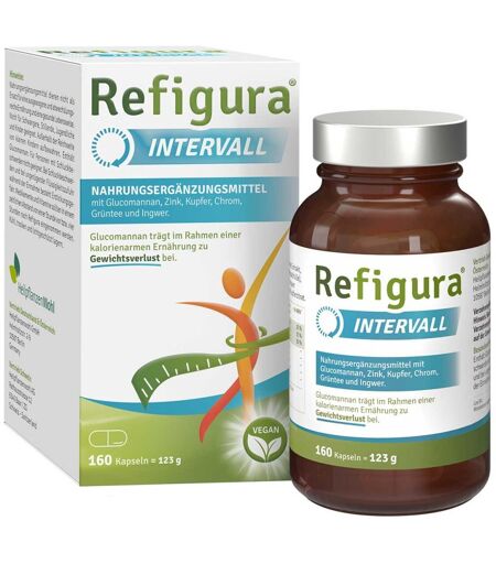 Anwendungsgebiet von Refigura Intervall KapselnRefigura Intervall Kapseln ist ein Nahrungsergänzungsmittel mit Glucomannan, Zink, Kupfer, Chrom, Grüntee und Ingwer. Glucomannan trägt im Rahmen einer kalorienarmen Ernährung zu Gewichtsverlust bei. Chrom unterstützt die Aufrechterhaltung eines normalen Blutzuckerspiegels. Zink trägt zu einem normalen Kohlenhydratstoffwechsel und Fettsäurestoffwechsel bei. Kupfer unterstütz einen normalen Energiestoffwechsel und trägt zur Erhaltung von normalem Bindegewebe bei.Wirkstoffe / Inhaltsstoffe / ZutatenZutaten von Refigura Intervall Kapseln:Glucomannanreicher Konjak-Wurzel Extrakt, Hydroxypropylmethylcellulose(Kapselhülle), Kartoffelstärke, Grüntee Extrakt, Ingwer Pulver, Zinkcitrat, Chrompicolinat,Kupfercitrat.Zusammensetzungpro Tagesdosis 6 Kapseln% NRVZink1,5 mg15 %Kupfer150 µg15 %Chrom12 µg30 %Konjak-Wurzel Extrakt3,2 gdavon Glucomannan3 gGrüntee Extrakt333 mgdavon Polyphenole199,5 mgIngwer Pulver210 mg * NRV = Nährstoffbezugswert für die tägliche Zufuhr (Verordnung (EU) Nr. 1169/2011)GegenanzeigenBei bekannter Überempfindlichkeit gegenüber einem der oben genannten Inhaltsstoffe sollte das Produkt nicht angewendet werden.DosierungVerzehrsempfehlung von Refigura Intervall Kapseln: