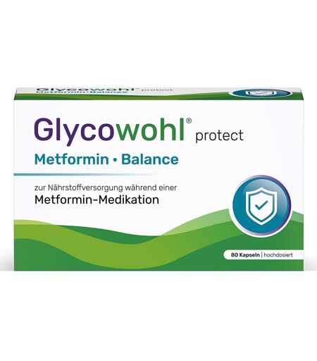 Anwendungsgebiet von Glycowohl® Metformin Balance Nährstoffversorgung KapselnGlycowohl® Metformin Balance Nährstoffversorgung Kapseln ist ein veganes Nahrungsergänzungsmittel und enthält einen hochwertigen 11-fach Spezialkomplex mit Vitamin B12, Coenzym Q10, Ingwer und weiteren wichtigen Nährstoffen, Vitaminen und Mineralstoffen. Dank Glycowohl® Metformin · Balance werden die Aufrechterhaltung des Blutzuckerspiegels¹, der Energiestoffwechsel² und die Schleimhäute³ unterstützt. Es dient zur Nährstoffversorgung während einer MetforminMedikation. Darüber hinaus enthält der Nährstoffkomplex einen hochwertigen IngwerExtrakt. Ingwer ist eine vielseitige Pflanze mit reichhaltigen Inhaltsstoffen und wird in der traditionellen Medizin geschätzt.¹Blutzuckerspiegel: Chrom trägt zur Aufrechterhaltung eines normalen Blutzuckerspiegels bei.²Energiestoffwechsel: Vitamin B12 trägt zu einem normalen Energiestoffwechsel bei.³Schleimhäute: Biotin trägt zur Erhaltung normaler Schleimhäute bei.Mit Ingwer-Extrakt.Wirkstoffe / Inhaltsstoffe / ZutatenZutaten von Glycowohl® Metformin Balance Nährstoffversorgung Kapseln:Magnesiumoxid, Reismehl vegan, Kapselhülle (Überzugsmittel (Hydroxypropymethylcellulose)), Coenzym Q10 (Ubichinon), Zinkbisglycinat, Cholin Bitartrat, Ingwer Pulver, Methylcobalamin, Natriumselenit, Cholecalciferol, D-Biotin, Chrom(III)- Chlorid Hexahydrat, Pteroylmono-glutaminsäure.Zusammensetzungpro Tagesdosis (= 2 Kapseln)% NRV*Magnesium175 mg47 %Coenzym Q10100 mg**Ingwer50 mg**Cholin21 mg**Zink15 mg150 %Biotin5 mg10.000 %Chrom501 µg1.252 %Vitamin B12500 µg20.000 %Vitamin B9 (Folsäure)400 µg200 %Selen202 µg367 %Vitamin D320 µg400 %* NRV = Nährstoffbezugswert gemäß Lebensmittelinformations-Verordnung (EU) Nr. 1169/2011**kein NRV festgelegtGegenanzeigenBei bekannter Überempfindlichkeit gegenüber einen der oben genannten Inhaltsstoffe sollte dieses Produkt nicht angewendet werden.Auf ...
