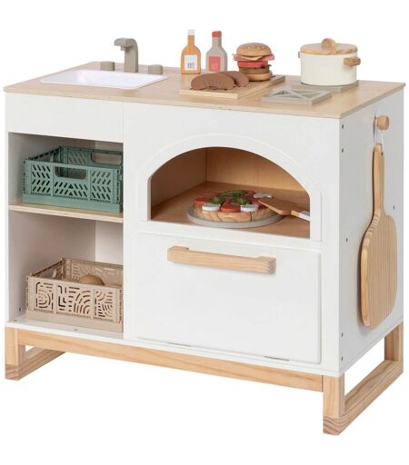 Die Kinderküche Taxus von Musterkind bietet Deinem Mini die ideale Basis, um im Spiel zum kreativen Pizza-Bäcker zu werden. Kinderküche Taxus von Musterkind Pizza-Ofen, Gaskochfeld mit 2 Flammen und Grill, Kunststoffspüle mit Wasserhahn, 2 offene Staufächer, 1 Klappfach mit Magnetverschluss, seitlicher Haken inkl. Pizza-Schieber 70(L) x 39(B) x 62(H) cm, Arbeitsflächenhöhe ca. 55 cm aus nachhaltig angebautem Holz, Kunststoff ab 3 Jahren geeignet In der Spielküche Taxus bereitet Dein Mini leckere Mahlzeiten zu. Neben einem Gaskochfeld mit zwei Flammen und einem Grill steht ihm dazu auch ein Pizza-Ofen samt Pizza-Schieber zur Verfügung. Lebensmittel und Geschirr kann Dein kleiner Sternekoch in den zwei offenen Staufächern oder dem mit einem Magnetverschluss versehenen Klappfach unterbringen. Der Abwasch wird in dem zur Ausstattung gehörenden Spülbecken erledigt. Die aus nachhaltigem Holz gefertigte Kinderküche animiert Dein Kind zu fantasievollen Spielen. Gemeinsam mit Geschwistern und Freunden schlüpft Dein Mini immer wieder in neue Rollen und lernt, verschiede Perspektive einzunehmen. Mit jeder Menge Spaß schult er dabei seine sozialen Kompetenzen. Hinweis Die Dekoration ist nicht im Lieferumfang enthalten. ...