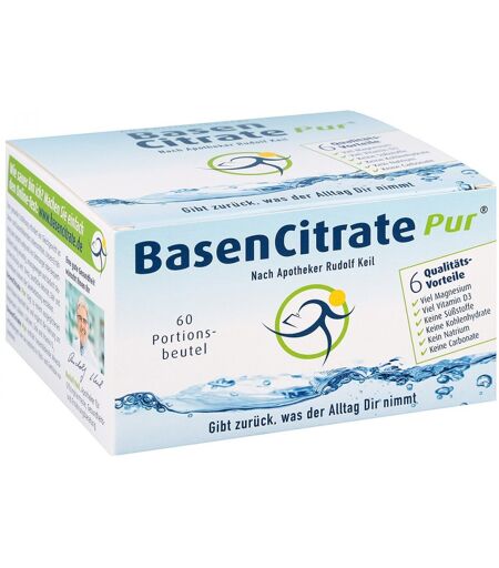 Anwendungsgebiet von Basen Citrate Pur nach Apotheker Rudolf Keil BeutelBasen Citrate Pur nach Apotheker Rudolf Keil Beutel trägt zu einem ausgeglichenen Säure-Base-Haushalt bei und ergänzt die Nahrung um Magnesium, Kalium, Calcium, Zink und Vitamin D3.Wirkungsweise von Basen Citrate Pur nach Apotheker Rudolf Keil BeutelEine gesunde Ernährung zeichnet sich durch ein Gleichgewicht an säure- und basenbildenen Nahrungsmitteln aus. Unsere heutige Ernährung ist jedoch eher mit Säuren belastet. Gerade durch den Stress und dem Mangel an Bewegung, sowie Diät- oder Fastenkuren kann die Säurebelastung in Ihrem Körper erhöht sein.