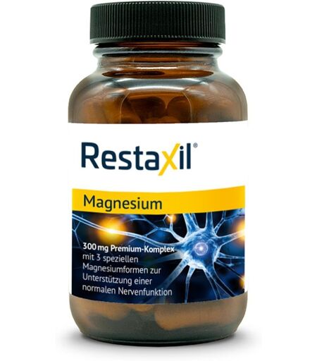 Anwendungsgebiet von Restaxil Magnesium KapselnDas Nahrungsergänzungsmittel Restaxil Magnesium Kapseln ist ein hochdosierter Premium-Magnesium-Komplex aus Magnesiumbisglycinat, Trimagnesiumdicitrat und Magnesiumoxid. Pro Tagesdosis enthält Restaxil Magnesium Kapseln 300 mg elementares Magnesium und ist somit optimal auf die tägliche Gesundheit angepasst. Dank speziell aufeinander abgestimmte Magnesiumformen ist eine besonders gute Aufnahme vom Körper möglich und eine langanhaltende Versorgung kann dadurch sichergestellt werden. Magnesium trägt zu einer normalen Funktion des Nervensystems bei. Außerdem unterstützt Magnesium eine normale Muskelfunktion. Magnesium trägt zur Verringerung von Müdigkeit und Erschöpfung bei. Wirkstoffe / Inhaltsstoffe / ZutatenZutaten von Restaxil Magnesium Kapseln:Magnesiumbisglycinat, Trimagnesiumdicitrat, Magnesiumoxid, Überzugsmittel: Hydroxypropylmethylcellulose (pflanzliche Kapselhülle), Reismehl, Trennmittel: Magnesiumsalze der Speisefettsäuren.Mineralstoffpro Tagesportion (2 Kapseln)NRV*Magnesium300 mg80%*% der Referenzmenge gemäß EU-Verordnung Nr. 1169/2011GegenanzeigenBei bekannter Überempfindlichkeit gegenüber einem der oben genannten Inhaltsstoffe sollte das Produkt nicht angewendet werden.DosierungVerzehrsempfehlung von Restaxil Magnesium Kapseln:Zweimal täglich je 1 Kapsel unzerkaut mit ausreichend Wasser einnehmen. Empfohlene Verzehrsmenge nicht überschreiten. Achten Sie beim Verzehr dieses Nahrungsergänzungsmittels auch auf andere Zufuhrquellen von Magnesium.PatientenhinweiseDie Kapseln sind glutenfrei und laktosefrei, vegan und für Diabetiker geeignet.HinweiseNahrungsergänzungsmittel sollten nicht als Ersatz für eine ausgewogene und abwechslungsreiche Ernährung sowie eine gesunde Lebensweise verwendet werden. Die angegebene empfohlene tägliche Verzehrmenge darf nicht überschritten werden. Auf den Verzehr weiterer Nahrungsergänzungsmittel mit Magnesium ist zu verzichten.Restaxil Magnesium Kap ...