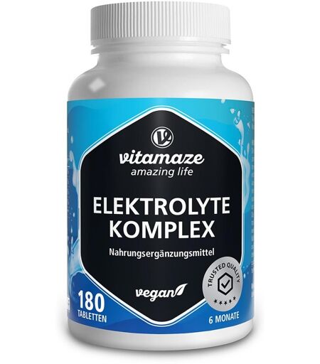 Anwendungsgebiet von Vitamaze Elektrolyte Komplex mit Magnesium Tabletten veganElektrolyte für Muskeln, Knochen, Elektrolytgleichgewicht und viele weitere Körperfunktionen(1,2,3)Vitamaze Elektrolyte Komplex mit Magnesium Tabletten vegan bieten einen umfassenden Mineralstoff-Komplex mit wichtigen essenziellen Elektrolyten (Calcium(1), Chlorid, Kalium(2), Magnesium(3) und Natrium) und eignen sich für eine einfache tägliche Versorgung. Jede vegane Tablette beinhaltet 1.034 mg Elektrolyte (Tagesdosis) – in gewohnter Vitamaze-Qualität. Magnesium trägt u.a. zur Verringerung von Müdigkeit und Ermüdung, zum Elektrolytgleichgewicht und neben Calcium zur normalen Muskelfunktion bei. Kalium unterstützt die normale Funktion des Nervensystems und der Muskeln.1.034 mg Elektrolyte pro Tablette (Tagesdosis)Elektrolyte: Calcium(1), Chlorid, Kalium(2), Magnesium(3) und NatriumMagnesium trägt u.a. zum Elektrolytgleichgewicht und zur normalen Muskelfunktion bei180 vegane Tabletten für 6 MonateVerzicht auf unnötige Zusatzstoffe, Nanopartikel und AllergeneVorteile Vitamaze Elektrolyte KomplexVegan: Hergestellt aus nicht-tierischen Inhaltsstoffen und frei von unnötigen ZusatzstoffenBeste Bioverfügbarkeit: Ohne das Trennmittel Magnesiumstearat (Magnesiumsalze der Speisefettsäuren) um die ideale Wirksamkeit zu erhaltenFrei von Farb- und Konservierungsstoffen, gentechnisch veränderten Inhaltsstoffen sowie Pestiziden, Fungiziden, künstlichen Düngemitteln oder sonstigen SchadstoffenFür Allergiker geeignet: Das Produkt ist frei von Gluten, Laktose und anderen AllergenenWirkungsweise von Vitamaze Elektrolyte Komplex mit Magnesium Tabletten veganVon der EU (EFSA - Europäische Behörde für Lebensmittelsicherheit) zugelassene und als sicher eingestufte Wirkungen:(1)CalciumCalcium trägt zu einer normalen Muskelfunktion beiCalcium trägt zu einem normalen Energiestoffwechsel beiCalcium trägt zur normalen Funktion von Verdauun ...