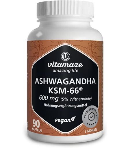 Anwendungsgebiet von Vitamaze Ashwagandha 600 mg KSM-66 KapselnVitamaze Ashwagandha 600 mg KSM-66 KapselnAshwagandha – der König der Adaptogene für deine innere Balance Ashwagandha (Withania somnifera) wird seit Jahrhunderten in der traditionellen Ayurveda-Medizin geschätzt und gilt als „König der Adaptogene“. Ashwagandha zählt zu den bedeutendsten Pflanzen ganzheitlicher Gesundheitsrituale. Ihre Wurzel steckt voller natürlicher, bioaktiver Wirkstoffe, die Körper und Geist auf sanfte Weise unterstützen.Vitamaze Ashwagandha 600 mg wird mit KSM-66® hergestellt, aus dem ganzheitlichem Wurzelextrakt, der die natürliche Zusammensetzung der Pflanze bewahrt. Jede vegane Kapsel liefert dir 600 mg reinen, konzentrierten Wurzelextrakt – so kannst du diese bewährte Pflanze ganz einfach und zuverlässig in deine tägliche Routine integrieren.Unser Ashwagandha-Extrakt wird sorgfältig in nährstoffreichem Boden angebaut und schonend verarbeitet – so bleibt das volle, natürliche Pflanzenprofil mit seinen bioaktiven Wirkstoffen erhalten. Wir verwenden ausschließlich die Wurzel, denn hier sind die wichtigsten Wirkstoffe am stärksten konzentriert. So garantieren wir dir ein hochwertiges Supplement ohne unnötige Zusätze, Allergene oder synthetische Inhaltsstoffe.Das moderne Leben ist schnelllebig und fordert viel von uns. Umso wichtiger ist es, dir regelmäßig natürliche Unterstützung zu gönnen – für mehr Balance, Energie und innere Stärke. Ob du einen vollen Terminplan meisterst, Stress bewältigst oder einfach eine bewährte pflanzliche Ergänzung für dein Wohlbefinden suchst – diese reine, pflanzliche Formel fügt sich perfekt in deinen Alltag ein.Wirkstoffe / Inhaltsstoffe / ZutatenZutaten von Vitamaze Ashwagandha 600 mg KSM-66 Kapseln:Ashwagandha-Wurzelextrakt (Withania somnifera, Wurzel) mit 5% Withanolide, Überzugsmittel (Hydroxypropylmethylcellulose pflanzliche Kapselhülle), Füllstoff (Akaziengummi).GegenanzeigenBei bekan ...