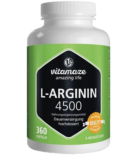 Anwendungsgebiet von Vitamaze L-ARGININ HOCHDOSIERT 4.500 mgVitamaze L-ARGININ HOCHDOSIERT 4.500 mg ist ein Nahrungsergänzungsmittel und enthält in jeder Kapsel 750 mg L-Argininhydrochlorid, wovon 622,5 mg reines L-Arginin sind. L-Arginin ist eine essentielle Aminosäure, die eine bedeutende Rolle bei der Bildung und Funktion von Proteinen spielt.