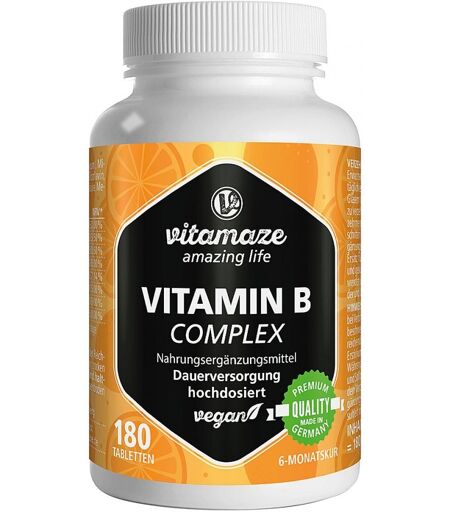 Anwendungsgebiet von Vitamaze VITAMIN B-Complex hochdosiert veganVitamaze VITAMIN B-Complex hochdosiert vegan ist ein Nahrungsergänzungsmittel mit Vitamin B1 (Thiamin), Vitamin B2 (Riboflavin), Vitamin B3 (Niacin), Vitamin B5 (Pantothensäure), Vitamin B6 (Pyridoxin), Vitamin B7 (Biotin), Vitamin B9 (Folsäure) und Vitamin B12 (Cobalamin).