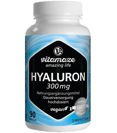 Anwendungsgebiet von Vitamaze HYALURONSÄURE 300 mg hochdosiert veganVitamaze HYALURONSÄURE 300 mg hochdosiert vegan ist ein Nahrungsergänzungsmittel und liefert pro Tagesdosis 300 mg hochdosierte Hyaluronsäure. Die Hyaluronsäure von Vitamaze weist eine hohe Bioverfügbarkeit auf. Dies wird durch einzigartige Micro-Moleküle mit einer Größe von 500 - 700 kDa erreicht, die eine effektive Aufnahme durch den Körper ermöglichen. Die Hyaluronsäure wird ausschließlich aus gentechnikfreiem Mais gewonnen, dabei erfolgt die Herstellung durch einen natürlichen Fermentationsprozess