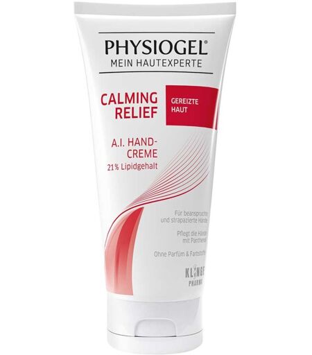 Physiogel® Calming Relief A.I. Handcreme pflegt die Hände mit Panthenol und natürlichen Fetten. Durch einen hautberuhigenden Wirkkomplex aus hautverwandten Lipiden und Palmitoylethanolamin (PEA) lindert sie Juckreiz und Rötungen. Sie ist geeignet für zu Neurodermitis neigende Haut.
